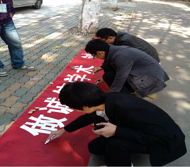 11月12日,在西校区西十四学生宿舍楼下,举行了以“做诚信学术,树诚信学风,创诚信校园”为主题的学术诚信签名活动,活动前期进行了校内海报宣传以及网络宣传,以提高大家对此次活动的积极性。活动过程中发放了宣传单,并进行了学术诚信签名。活动得到大家的广泛关注和支持,同学们踊跃参与,并在宣传横幅上签名,纷纷表达了对此次学术诚信活动的认同,表示将在今后会自愿以诚信科研要求自己,自觉加入到学风道德建设的潮流中来。