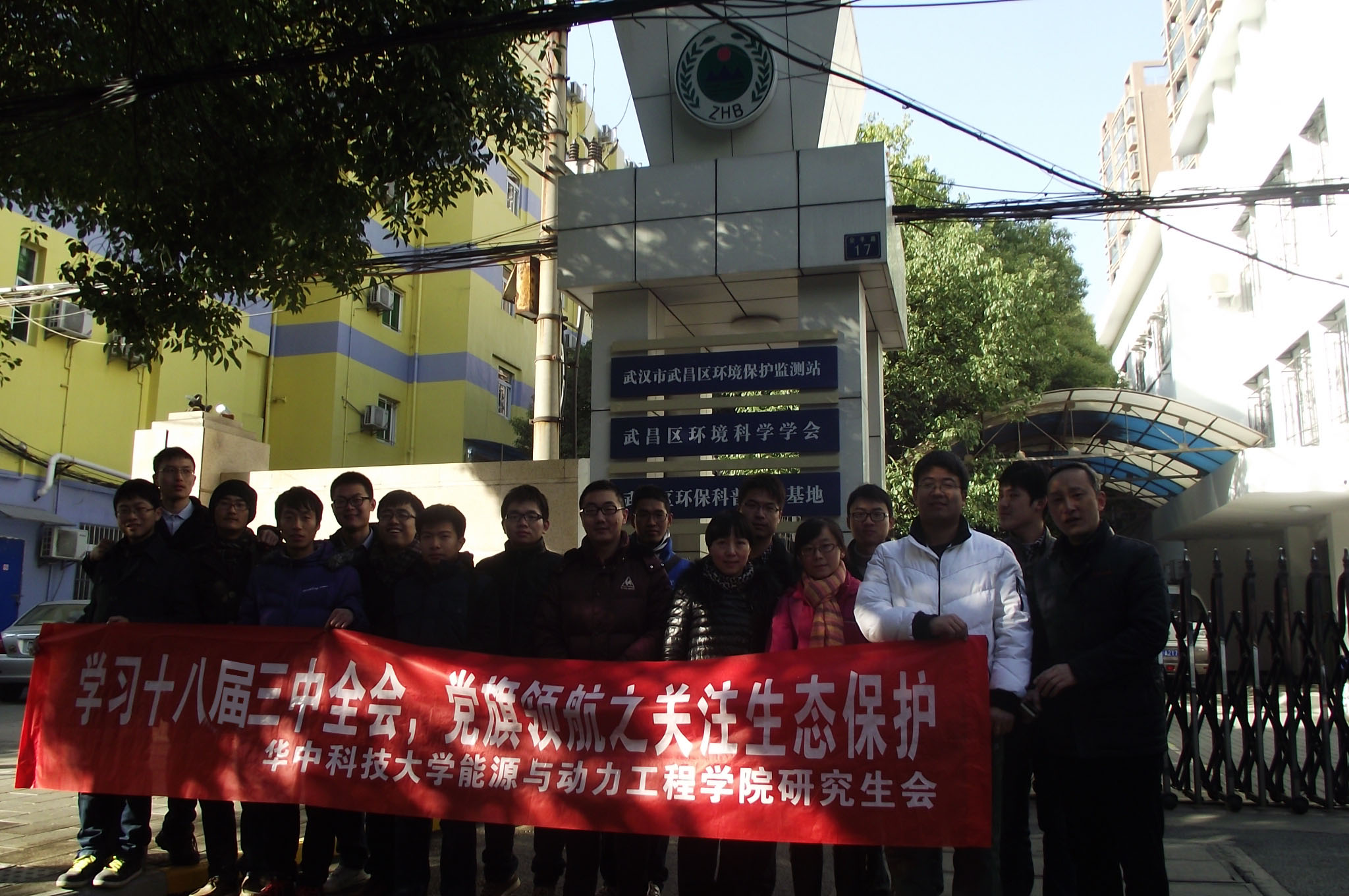2013年12月27日上午,华中科技大学能源学院“学习十八届三中全会,党旗领航之关注生态保护”活动在武昌区环保局环境检测站圆满谢幕。为了进一步弘扬十八届三中全会建设生态文明共建美丽中国的理念,深入学习和贯彻十八届三中全会关于环境保护的会议精神,提高学院学生的环境保护意识并加速完成建设美丽武汉美丽校园,华中科技大学能源学院党总支和能源学院研究生会组织部一起开展了华中科技大学能源学院“学习十八届三中全会,党旗领航之关注生态保护”活动。