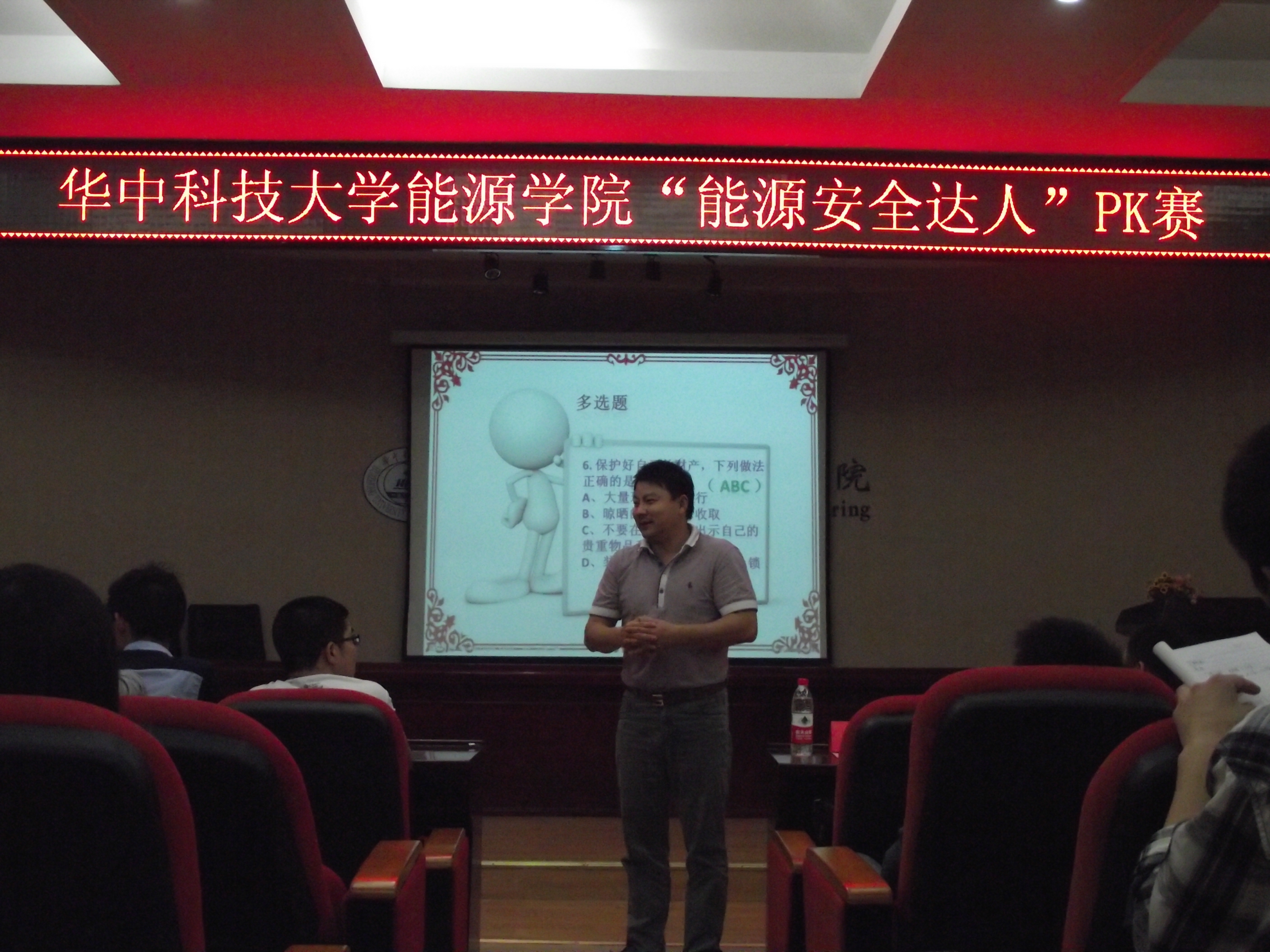 5月12日晚七点,由能源学院研究生会举办的“安全达人”PK赛在动力楼402成功举行。出席本次活动的评委嘉宾有保卫处治安与消防管理科毛天音、熊开伟老师和能源学院研工组李智老师。此次共有7支队伍参与竞赛,部分同学到场观看了竞赛。本次活动的最大特色是将师生互动引入竞赛环节,使得老师能够现身说法,教同学们如何应对危险,如何安全生活。