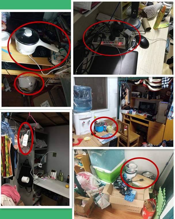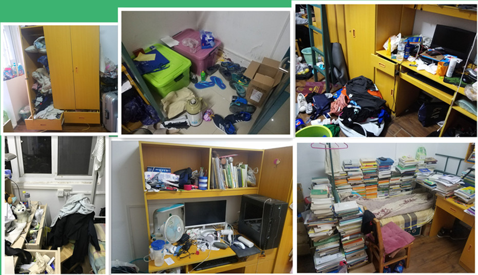 地面不干净,桌面不整洁,床褥不整齐,有垃圾堆放;有脏衣服;宿舍有电饭煲;插线板周围有堆积和放在床头的现象 |