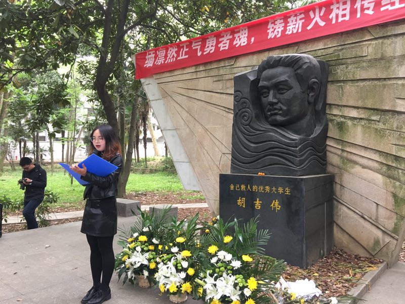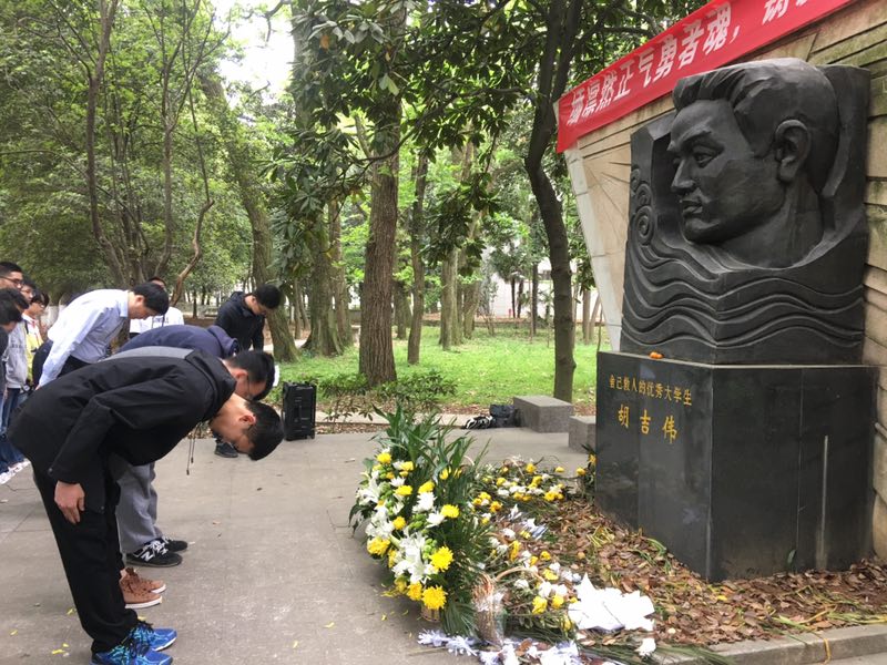 中午12点40分,祭扫在学院学工组长、分团委书记罗迪的主持下正式开始。师生在青年园胡吉伟塑像前庄重肃立,全体默哀一分钟。接着,青马班学员代表、党员代表、团员代表向胡吉伟塑像献上花篮并鞠躬,表示对英雄的沉重悼念。