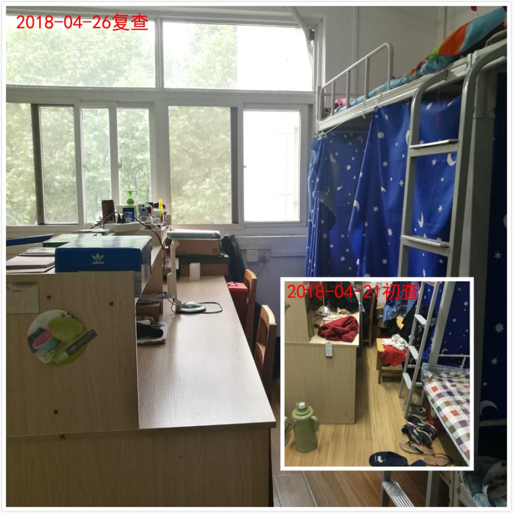 在复查走访过程中,大家欣喜地发现,初查发现的问题宿舍大部分都进行了细致的整改,整体的卫生状况良好,物品摆放整齐有序,同学们在整洁温馨的宿舍等候复查。