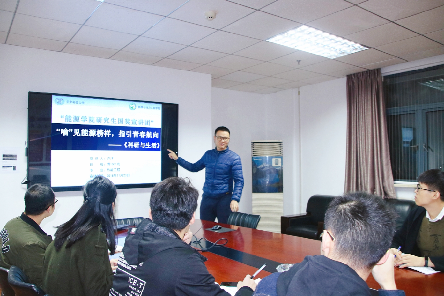 (通讯员:韩阳 孙铭跃)为深入贯彻学习党的十九大精神和我校第四次党代会精神,让“学在华中大”的品牌更加响亮,引导带动广大华中大学子向上向善、追求卓越,能源学院于2018年11月邀请荣获本年度国家奖学金的11位同学组成宣讲团,在硕博24个支部的组织生活会上,分享他们关于学习、科研、时间管理、学生工作等方面的独特见解。