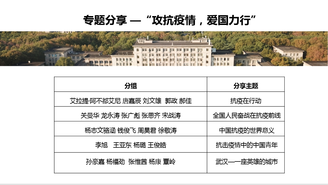 疫情发生以来,中国道路和中国制度令人自豪,无数抗疫故事温暖人心。各班级以各种形式进行专题分享,讲述一个个有力量、有温度的故事。能动1908班同学以“翻转团课”的形式分组讲述抗疫中的中国故事,分享所见所闻和所思所想,孙豪嘉等五位同学采用在线朗诵的形式,向逆行者致敬,为中国加油,为武汉加油。能卓1901班同学以寄语留言的形式,向祖国表达心声,传递青年力量。