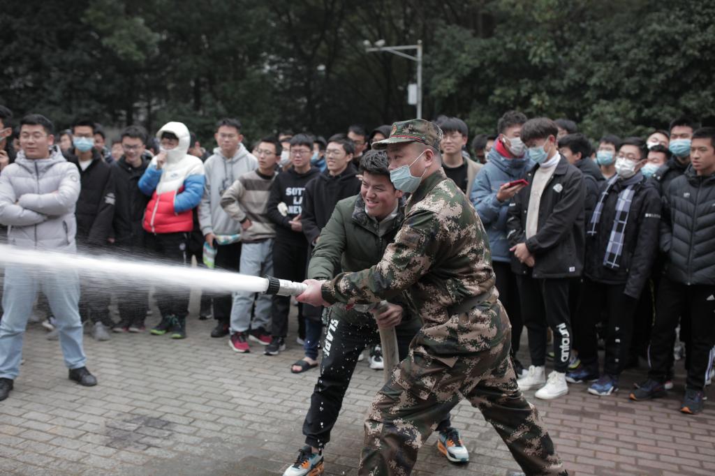 随后,同学们在紫菘广场上进行灭火器材实操培训,消防人员详细讲解并现场演示灭火器和消防栓水管的使用办法。在消防人员的带领下,各班学生代表学习并操作了灭火器和消防栓水管。