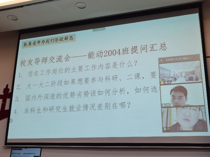 能动2007班校友导师雷嗣远现任西安热工院苏州分公司工程师,他详细解答了班级同学最关心的就业问题,告诉同学们能源领域有很多高新技术相关岗位,并且非常渴求人才,同学们要刻苦学习练好本领,发掘自身优势、提升自身能力。