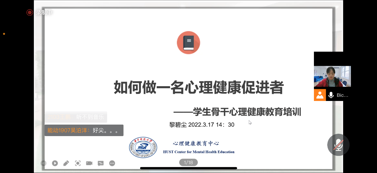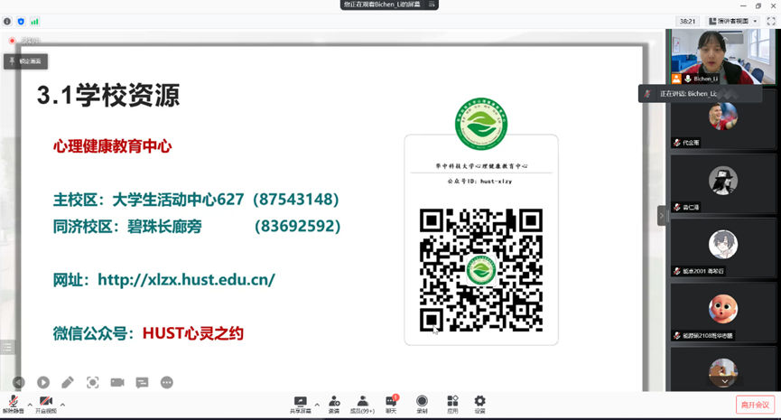 作为一名“心理活动的发起人”,老师倡议学生骨干要积极开展各类集体心理活动,向同学们分享各类心理活动与讲座资源,并且介绍了心理健康教育中心的各类活动、团体与咨询资源。