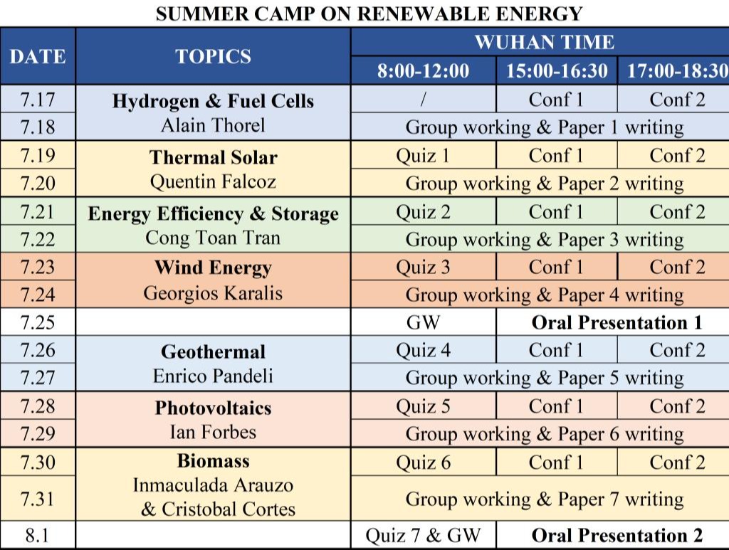 邀请中欧清洁与可再生能源学院的资深外籍教师代表,开设可再生能源领域的七大专题课程,分别为“氢能及燃料电池”“太阳能光热”“能源效率及储能”“风能”“地热能”“太阳能光伏”及“生物质”。各专题课程分别有两节子课程,共计十四次课,课程设置情况如下。