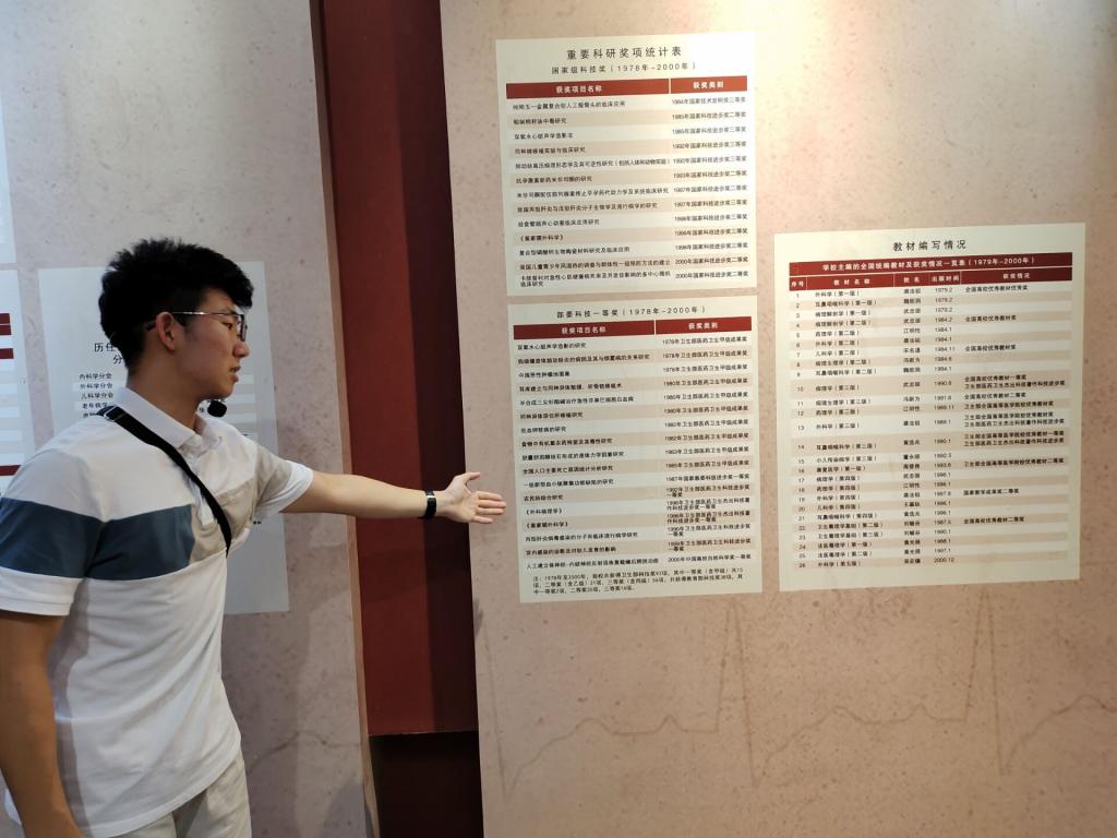 首先,同学们在解说员韩嘉浩带领下参观了校史馆历史厅。沿着既定的路线,同学们最先看到的是同济医科大学的发展历程。一张张图片、一段段文字,加上解说员的讲解,从20世纪初德文医学堂的建立到抗战期间国立同济大学医学院的迁移,再到建国后与武汉大学医学院合并为中南同济医学院,直至2000年与华中理工大学和武汉城市建设学院合并为华中科技大学,同济医科大学的发展史清晰地呈现在同学们眼前。此外,同学们还了解了李赋京教授、姚永政教授、过晋源教授、裘法祖教授等人的事迹,同学们对他们的学术造诣与医者仁心都真心佩服。