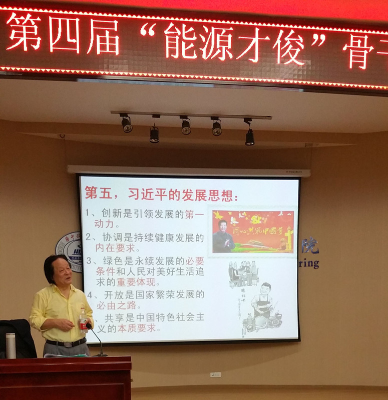 后来刘家俊教授分别总结了毛泽东,邓小平,江泽民,胡锦涛,习近平的发展思想。他的讲演幽默风趣,意蕴深厚,富有哲学味道,并且善用丰富的事实阐述道理,将枯燥的知识讲的生动有趣。并且他用语精准,严谨,在他谈及与能源专业相关知识的例子时,只讲了自己有把握的,谦虚的承认了自己不太了解的部分,体现了一个大学者的严谨。
