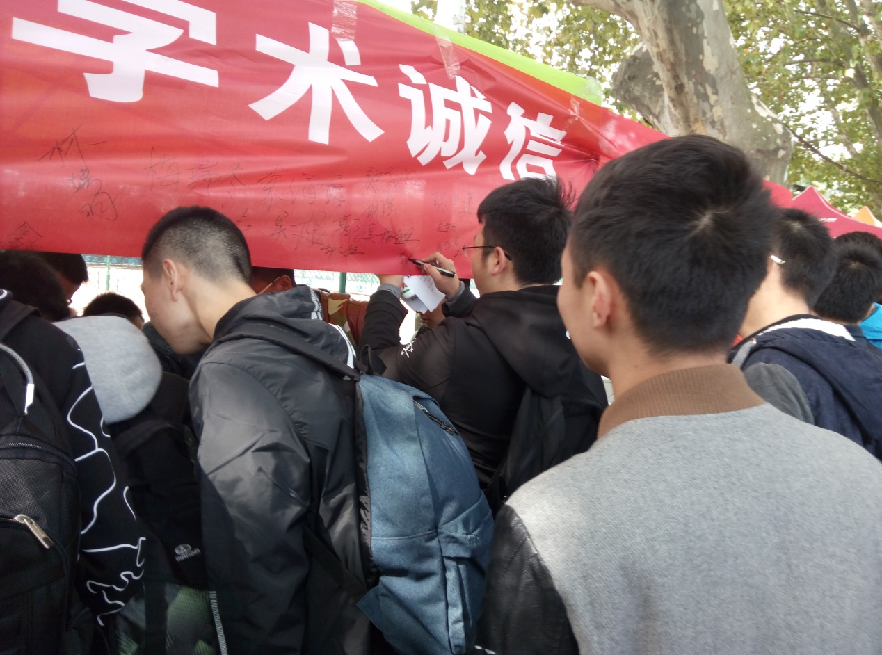 11月10日当天,能源学院研究生会学术部于华中科技大学主校区西操场设立KT版,向广大师生介绍学术不端行为并普及相关危害及处理措施。同时,研究生会针对违反学术诚信及学术规范行为的认识,展开了对学术群体的调查问卷,在12道判断题中调查师生对学术不端行为的认知现状。为号召广大师生加入到倡导学术诚信的队伍当中,活动设立“学术有道、诚信为德”的签名环节,并获得广泛认同、支持。