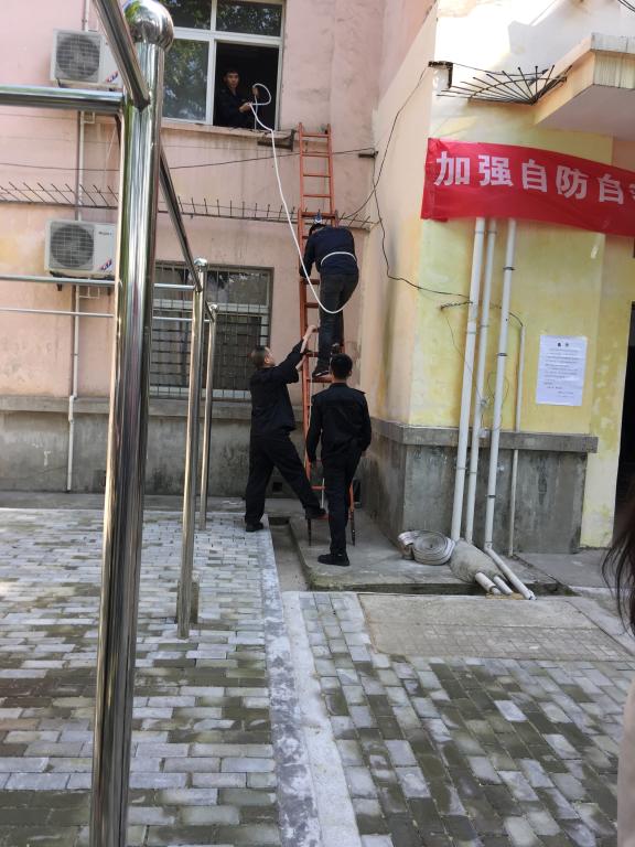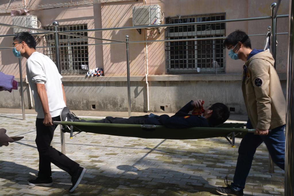 同时西六舍一楼某房间的“受伤”学生,被同学用担架抬出,并送达指定地点进行救护。在西六舍二楼模拟火灾现场火势凶猛、浓烟滚滚被困室内无法逃生的情况,一学生从窗口爬消防梯紧急逃生。