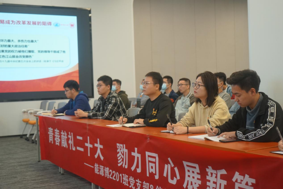 活动第二项,党员干部领学二十大报告精神。硕2205班党支部书记孙春辉、副书记赵雪对党的二十大报告进行行文梳理,并就十五个部分进行了重点剖析。博2201班党支部书记贝雷带领同志深刻理解“中国化时代化的马克思主义为什么行?”等话题,并结合能源背景解析报告第十部分“推动绿色发展,促进人与自然和谐共生”,明确能源人的使命担当。党员同志们学习、热议党的二十大精神,共话支部发展新方向。