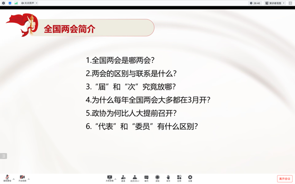 首先,朱琳同志带领全体成员共同学习了第十四届全国人大一次会议的主要内容。她通过视频的方式生动地讲解了”什么是两会”,并重点解读了2023年《政府工作报告》。报告以沉甸甸的“数据清单”展现了过去一年和五年来我国经济社会发展取得的重大成就,以真抓实干的举措总结了五年来各级政府深入贯彻党中央决策部署的奋斗实践。参会党员一致认为,这份报告充分彰显了全国各族人民为把我国建设成为富强民主文明和谐美丽的社会主义现代化强国而团结奋斗的韧劲、干劲和闯劲。报告学习后,张琳同志通过人大代表微风采展示的形式,致敬千千万万个新时代的建设者与奋斗者。全体成员针对“我国就业形势与政府稳就业措施”、“中美关系与改善前景”两个热点人大话题进行了讨论分享。