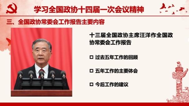 接着,田芮莲同志主持学习全国政协十四届一次会议精神。介绍了会议概况,带领学习了习近平总书记的重要讲话精神,并梳理分享了全国政协常委会工作报告的主要内容。田芮莲同志号召在场党员同志们凝心聚力、团结奋斗、踔厉奋发、勇毅前行,为以中国式现代化全面推进中华民族伟大复兴的中国梦而不懈奋斗。