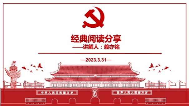 最后,赖亦铭同志分享经典阅读:《习近平谈治国理政(第三卷)》。赖亦铭同志讲到,书中的殷殷嘱托、切切关怀,寄托着习近平总书记对新时代青年的厚望。青年兴则国家兴,青年强则国家强,当代青年要理想坚定、本领过硬、奋斗不止,才能不辜负党的期望、人民期待、民族重托,不辜负伟大时代。