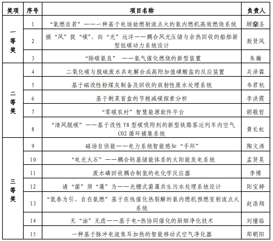 华中科技大学第十七届大学生节能减排社会实践与科技竞赛自组织以来,经各院系师生踊跃报名、初赛推荐及决赛评审,共评选出3个一等奖、5个二等奖和7个三等奖,具体名单公示如下(按项目名称首字母排序):