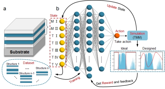 波长选择性热辐射器的材料和结构通常因应用而异,导致设计者需要对不同的应用下的材料和结构具有完备的先验知识,这对建立跨不同应用的发射率工程的通用设计框架带来了严峻的挑战。此外,如果考虑热辐射器材料和结构的同时设计,将会导致巨大的优化设计空间,使得基于手动的人工优化策略不可行,传统的机器学习方法效率低下,因此以往的大多数研究要么固定材料来设计结构,要么固定结构尺寸来选择合适的材料,以减小优化设计空间,提高设计效率。然而,实现材料和结构的同时设计是建立跨不同应用的发射率工程的通用设计框架的本质需求,这对如何在同时考虑材料选择和结构设计的大优化空间中实现热辐射器的高效设计提出了更高的要求。