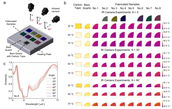 为了解决上述问题,胡润副教授团队提出了一种基于材料信息学(MI)的逆向设计框架,通过仅评估约1%的候选材料,有效地设计多层锗(Ge)和硫化锌(ZnS)超材料。通过实验验证,所设计的超材料在不同的观察角度和温度下均表现出优异的颜色匹配性能和红外伪装性能。设计流程包括将多层超材料编码为二进制数字、使用TMM进行物理模拟、可见光和红外伪装评估、厚度评估的发射率灵敏度、性能表征(FOM)和贝叶斯优化过程(BO)。该超材料结构包括生长在石英衬底上的非周期Ge和ZnS多层层以及最上层的ZnS层。顶部ZnS层用于可见光伪装,而底部的Ge/ZnS多层用于红外伪装。为评估可见光伪装性能,将获得颜色与目标颜色在CIE-LCH色彩空间中的色差(ΔECMC(l:c))作为评估指标。为评估红外伪装性能,同时考虑了发射率光盘和目标温度,定义了一个无量纲红外伪装评价因子——热信号比(RTS),用于表示设计的超材料在相同环境(但不相同温度)下与黑体的热辐射功率之比。除了可见光和红外伪装性能外,还首次评估了实验制造的厚度灵敏度(SET),并将其反馈到优化中。将ΔECMC(l:c)、RTS、SET的乘积作为最终的FOM。通过BO使FOM最小化,可以有效地优化超材料结构,在迭代步骤<总候选项的1%内达到最优值。作者对不同颜色目标进行了60轮优化,得到了其在CIE1931色彩空间中的分布,表明了超材料结构可以达到的可行的颜色范围。随机选择了8种超材料结构进行制备和实验验证,展现了出色的角度和温度无关的可见-红外兼容伪装性能。