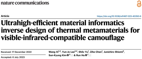 新闻网讯8月4日,yl23411永利集团胡润副教授团队在可见光-红外伪装超材料逆向设计领域取得重要进展,相关成果发表于《自然·通讯》(Nature Communications, 2023, 14: 4694),题目为“可见-红外兼容伪装热超材料的超高效率材料信息学逆向设计”(Ultrahigh-efficient material informatics inverse design of thermal metamaterials for visible-infrared-compatible camouflage)。华中科技大学为第一通讯单位,能源与动力工程毕业硕士生席望和韩国庆熙大学研究生Yun-Jo Lee为共同第一作者。硕士生余士律、博士生陈子禾以及日本东京大学Junichiro Shiomi教授为共同作者,胡润副教授和庆熙大学Sun-Kyung Kim教授为通讯作者。