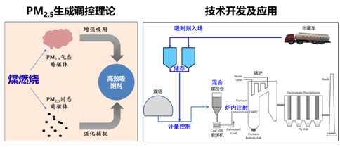 大气PM2.5污染严重危害生态环境及人类健康,燃煤电站是重要的PM2.5排放源。团队发明一种基于高效吸附剂的燃煤PM2.5生成调控技术,通过燃烧中抑制PM2.5的生成,从“源头”实现其深度减排,是对传统燃烧后物理除尘技术的原创性突破。技术还具有协同脱除其它污染物和缓解锅炉结渣沾污的作用,受国家重点研发计划项目支持,首次在全球最大规模燃煤机组实现成功应用,具有重要推广应用价值。