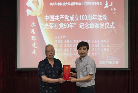 本站讯(通讯员 兰秋华)百年征程波澜壮阔,五十余载初心不改。为迎接中国共产党成立100周年,让“光荣在党50年”的老党员深切感受到以习近平同志为核心的党中央的温暖关怀,坚定永远跟党走的信念和情怀。6月23日,能源学院在动力楼201隆重举行“光荣在党50年”纪念章颁发仪式,学院党委书记姚洪为“光荣在党50年”的老党员们颁发纪念章,颁发仪式由学院党委副书记、副院长张立麒主持。