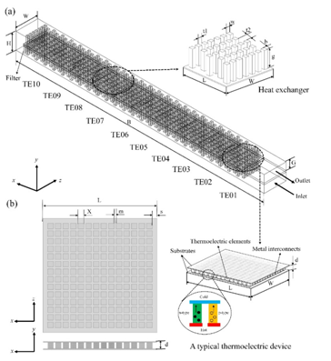 图1(a)空气消毒热电加热/冷却集成系统示意图;(b)典型热电片的示意图。