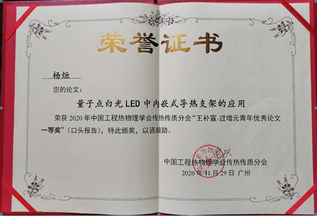 2020年中国工程热物理学会传热传质学术会议暨国家自然科学基金项目进展交流会于11月27日至29日在广州举行。推荐青年优秀论文口头报告经过专家评委的评审,yl23411永利集团2020级研究生杨烜以优异的表现荣获“王补宣-过增元青年优秀论文一等奖”(口头报告)(全国今年唯一的一等奖)。获奖论文的题目为《量子点白光LED中内嵌式导热支架的应用》,指导老师为罗小兵老师,该论文设计了一种新型的量子点白光LED的封装结构,有效增强LED的散热,能够使LED在工作时的工作温度降低30℃,并且维持了它原有的各项光学性能基本不变,具有一定的创新性与应用潜力。这也是我校首次在中国工程热物理学会传热传质学术会议中获得该奖项。