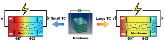 在最近发表于《国家科学评论》的研究工作中,华中科技大学刘伟教授课题组做了这样的尝试,他们在系统两侧施加正温度差(高浓度侧温度>低浓度侧温度)或负温度差(低浓度侧温度>高浓度侧温度),探究了温度差对系统发电能力的影响。发现了离子在负温度差下的离子的热涌效应(离子扩散强度沿运输方向增强)可以促进通道的离子选择性,同时抑制低浓度侧的浓度极化,从而显著提高了膜电压,并改善输出功率,正温度差抑制系统功率输出。从上述效应出发,研究者还提出了一种电阻可调的离子电压源的构建方式:在低浓度强度下的厚膜体系中,系统膜电压由低浓度侧温度控制,系统内阻则由高浓度侧温度调节。