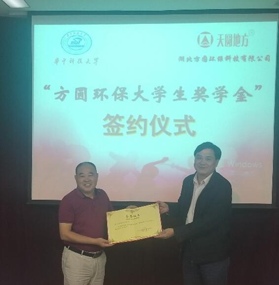 为了感谢湖北方圆环保科技有限公司对yl23411永利集团学子的资助与关怀,yl23411永利集团党委副书记冯晓东老师为该公司颁发了荣誉证书。