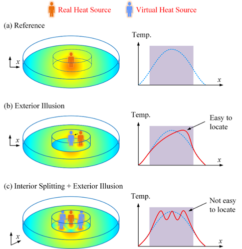 自然界中“海市蜃楼”是一种具有迷惑性和欺骗性的光学幻象现象,其本质是由于加热或蒸发引起的空气或蒸汽的密度非均匀,导致光线传播时发生偏折产生幻象。类似的,一个具有任意形状、位置、尺寸、材料的物体当被红外摄像时也可被识别不同形状、位置、尺寸和材料的其他物体,这称为热学幻象。自然界中有许多这样的动物,比如变色龙、蜘蛛、乌贼、章鱼等,都拥有令人称奇的改变身体颜色的能力,创造出光学或热学幻象来伪装自己,实现保护、捕食、繁衍等。受自然界光学、热学幻象现象的启发,基于人工结构超材料的光学幻象和热学幻象器件得到了极大的发展,尽管研究者们已经从理论和实验中实现了幻象的异位、变形等,但是单个虚拟幻象依然会暴露实际目标的位置(图(b)),因此都不能够从本质上实现真正的幻象。