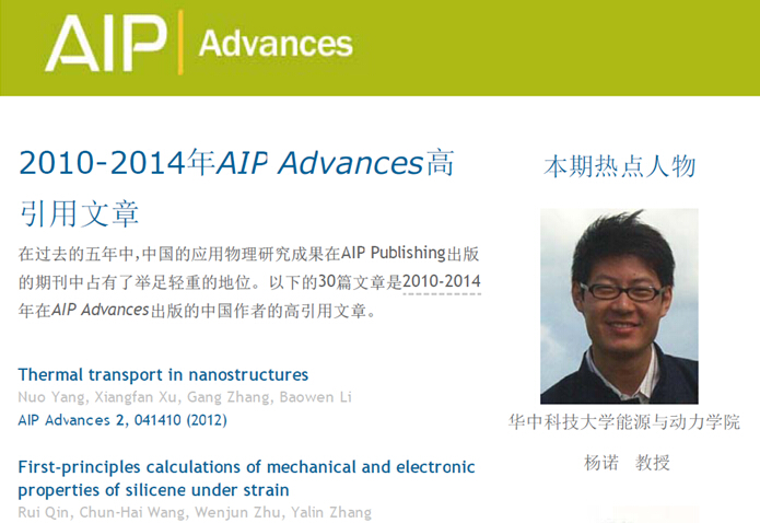 近年来,中国的应用物理研究逐渐发展,并开始在AIP的出版中占据举足轻重的地位。yl23411永利集团杨诺教授及其合作者的文章“Thermal transport in nanostructures”入选AIP最新评选出的30篇从2010年到2014年间AIP Advances出版的中国作者的高引用文章,而杨诺教授本人也被评为该期热点人物。在热烈祝贺杨诺教授的同时,也期待他指导的纳米传热实验室再接再厉,在应用物理和能源利用领域做出更多贡献。