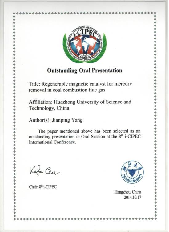 2014年10月16日到18日,在浙江大学承办的第8届燃烧、焚烧热解、排放和气候变化国际会议(The 8th International Conference on Combustion, Incineration Pyrolysis, Emission and Climate Change)上,华中科技大学煤燃烧国家重点实验室赵永椿、张军营、郑楚光教授课题组的博士生杨建平的报告“Regenerable magnetic catalyst for mercury removal in coal combustion flue gas”获得最佳口头报告奖(Outstanding presentation in Oral Session at the 8thi-CIPEC International Conference),该报告介绍了利用飞灰中磁珠脱除燃煤电站烟气中单质汞的最新研究进展和成果。