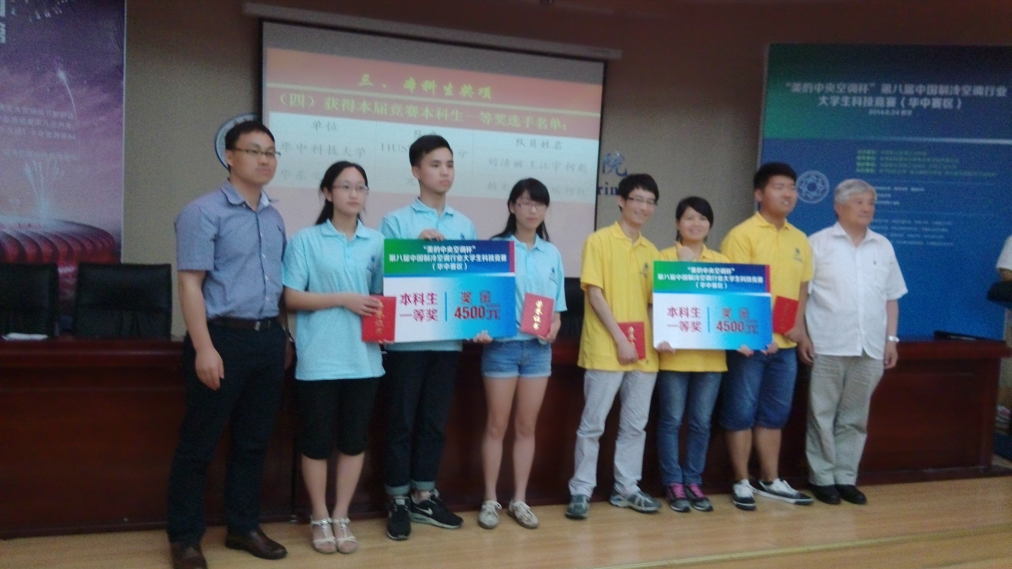 2014年6月24日下午,为期两天的“美的中央空调杯”第八届(华中赛区)制冷空调行业大学生科技竞赛圆满落幕。据悉,本次比赛由中国制冷空调工业协会主办,教育部能源动力专业教学指导委员会指导,华中科技大学,湖北省制冷学会,湖北省空调制冷行业协会协办,美的中央空调公司赞助。比赛为期两天,分为研究生组和本专科组,分为实践操作,创新答辩,知识竞赛三个环节,共有来自湖北、湖南、河南、江西、台湾的16所大学参赛。经过两天的激烈角逐,yl23411永利集团刘洁丽、何彪、王江宇同学组成的“HUST能源小分队”夺得(本专科组)团队一等奖。yl23411永利集团制冷方向阚超获得研究生组一等奖,梁婷与张青均获得研究生组三等奖。