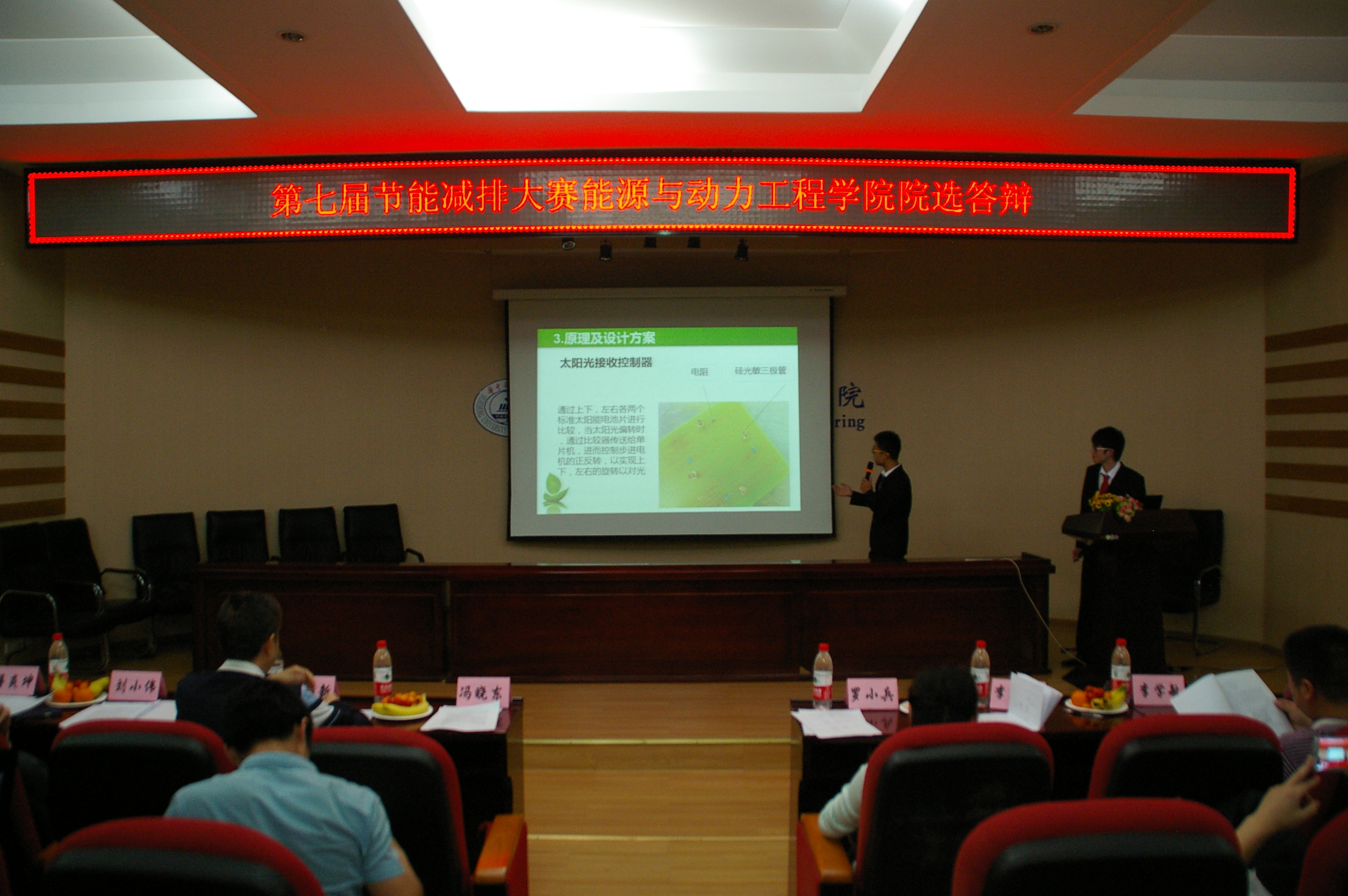 经过三月初的竞赛宣传和动员,能源学院共有37支学生团队项目报名参赛。4月底对37项项目进行了初审,最终确定20支队伍进入学院选拔。本次答辩,主要形式是作品PPT介绍以及模型展示,每一组由五分钟的答辩时间,答辩完毕后评委依据答辩内容进行提问。本次大赛的参赛队伍多为大二、大三的学生,也有部分大一的学生以团队成员方式参与到项目中来。同学们积累了一定专业知识的同时,留心观察身边有关节能减排的创意,并通过查阅资料、无数次的头脑风暴和试验,确定了最终作品方案。从太阳能追踪到太阳能与风能一体化利用,从光纤输电到节能生物质炉,从冷热电联供到垃圾收集船等等创意,同学们思路广泛,新意十足。评委们认真听取各支队伍的答辩展示,充分肯定了同学们的创意设想,并根据同学们的作品特点,针对性地提出了后续改进的建议。