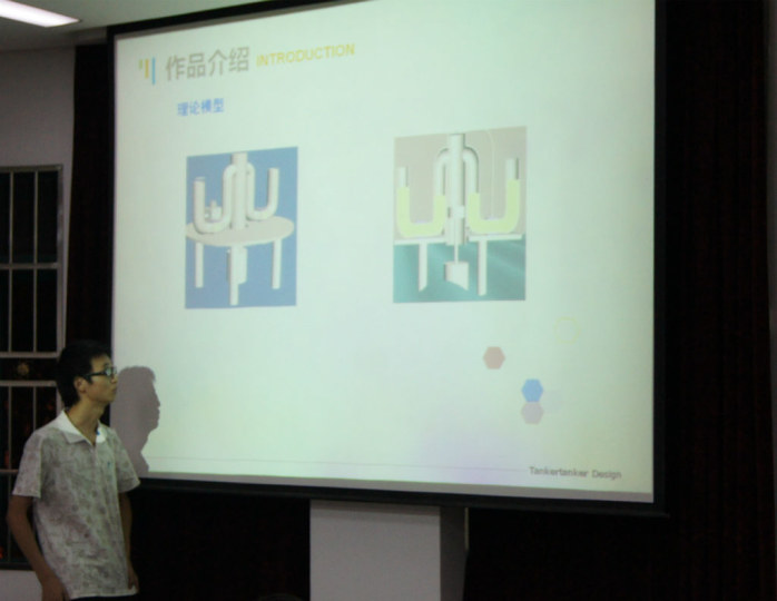 颁奖结束后,团队展示开始。首先上场的是特等奖“基于磁流体共振的波浪能发电装置”队伍代表刘毅。刘毅同学首先简单介绍作品后列出了队伍的比赛日程,并详细介绍他们团队每个阶段所做的工作。经历10个月的充分准备,明确的分工、创新的设计、精确的加工制造,团队的团结和努力,最终使他们登上最高领奖台。然后是“一种基于直线发电机的可控姿态波浪发电装置”队伍代表周思立。周思立同学参加了两次比赛。第一次参加全国挑战杯比赛,但遗憾止步省赛。在挫折面前,经过总结,重新组队,继续参加接下来的节能减排大赛。通过学院的老师帮助,一次次实验,一步步修改,一边做实物,一边对理论模型进行修改,经过一个暑假的努力后,终于在上海举办的第六届全国大学生节能减排大赛上获得了全国一等奖。随后进行报告的还有在大赛中获得二等奖的“变传动比节能厢式电梯”、“新型智能节水洗衣机”、“零能耗海岛大气取水系统”、“基于Peltier效应的回热节能干衣机”队伍。尤其是“零能耗海岛大气取水系统”队伍,这支队伍是由当时的大二学生组成的,开启了低年级同学参加科创的先河。会后讨论环节,低年级同学也谈了自己的感想以及将来参与科创活动的一些计划。