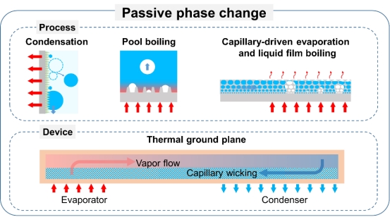 在被动式相变换热过程中,针对冷凝和池沸腾中汽泡/液滴的成核与脱离对表面的润湿性和结构尺度的矛盾需求,提出了多尺度分区的结构表面调控成核与脱离过程,论述了利用汽液分离实现传热强化的表面设计及其未来发展方向;针对毛细蒸发过程中单一液膜输运的调控难以协同降低热阻和提高传热极限的难题,探讨了利用结构表面开发新型供液方案的重要性;针对汽泡与液膜耦合调控的薄液膜沸腾传热技术,论述了协同优化薄液膜与汽泡输运实现更高传热性能的关键物理机理和表面构筑策略。此外,热管和均热板综合利用了冷凝、蒸发、沸腾的传热机理,其等效导热系数相较于纯铜提高了1到2个量级,目前已成为高度集成化电子设备所广泛采用的散热器件。该综述针对均温板内部调控液滴/汽泡/液膜的表面设计策略进行了深入探讨,并指出面向超薄化、柔性化与高热流散热场景的均温板发展方向。