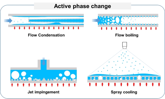 相较于被动式相变过程,主动式相变过程依靠外部泵功实现了更高速的汽液输运,因此具有更好的换热性能。该综述系统探讨了微纳结构表面流动冷凝、流动沸腾、射流冲击和喷雾冷却等主动式相变换热技术的强化机制与未来发展方向。流动冷凝过程中利用限制层结构可减薄冷凝液膜厚度,实现换热强化。利用歧管对流动沸腾进行供液有利于提高温度均匀性,并加强两相搅混实现更高的临界热流密度。在射流冲击过程中,采用分布式射流阵列与回流孔阵列能够在大面积热源表面实现均匀散热,改善横流效应并降低两相流不稳定性。通过构建多级微纳结构,缩短汽泡脱离路径和构建汽液分离通道,可显著改善喷雾冷却过程中的汽液逆流,实现更高的换热性能。通过优化微纳结构表面,目前流动沸腾、射流冲击和喷雾冷却等传热技术均可实现超过1kW/cm2的热流密度。然而,这些主动式散热技术在系统复杂度、流动稳定性、温度均匀性等方面存在各自的优势与限制,发展新型散热技术,有望促进主动式相变换热的进一步发展与应用。