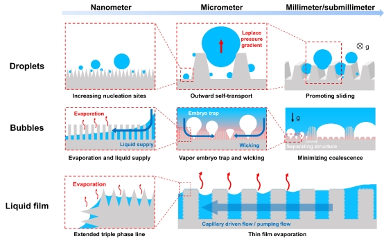 图2. 微纳结构表面对相变过程中液滴、汽泡、液膜的调控