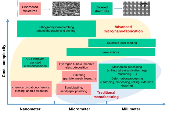 该综述从固体表面的润湿性、汽液界面的热质传递以及液滴、汽泡、液膜的多尺度动力学特性三个方面,系统阐述了微纳结构表面调控汽液相变过程的基本机理。文章重点探讨了通过设计多尺度微纳复合结构与非均匀润湿表面来优化汽液相变换热性能的物理机制,指出精准调控表面形貌、润湿性及微纳结构尺度分布是实现高效相变换热的关键。同时,该综述系统梳理了微纳结构表面制备工艺,从加工结构特征、精度、工艺复杂性与成本效益等维度,评估了各工艺对不同汽液相变过程的适用性,为强化相变换热表面的设计、制备与应用提供了重要参考。