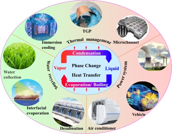 汽液相变是自然界中一种常见现象,如云雾凝露、水汽蒸腾等。汽液相变过程能够在小温差下释放或吸收大量相变潜热,展现出优异的传热性能,已广泛应用于火电厂、核电站、石油化工、食品加工、空调、化工精炼、水淡化与回收以及电子设备热管理等工业领域。提高汽液相变换热性能对于提高能源利用效率与实现高热流散热具有重要意义。汽液相变过程涉及到复杂的多尺度现象,包括微观界面流体运动和固体表面润湿性等因素,涵盖了汽-液-固三相界面的相互作用与演化过程。因此,深入理解固体表面上的多尺度汽液动力学特性,调控表面的形貌和理化性质,能够实现汽液相变传热强化,为能源利用与散热技术的发展提供先进的理论与技术支持。