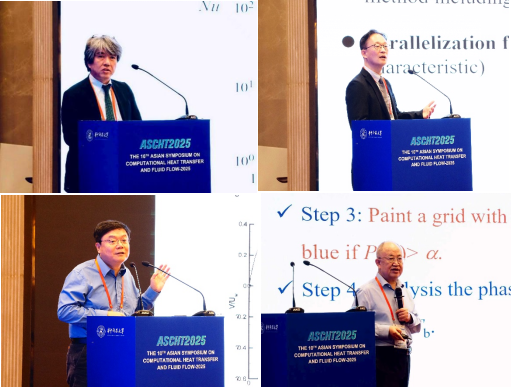 大会报告环节,在韩国Gihun Son教授和日本Mamoru Tanahashi教授共同主持下,大阪大学Genta Kawahara教授探讨了壁面有界湍流中的热量传递机制;弘益大学Seungwon Shin教授介绍了高精度界面追踪算法在模拟液滴撞击复杂固体几何表面过程中的应用;香港科技大学徐昆教授分享了从稀薄流到湍流的多尺度输运建模与计算研究;华北电力大学徐进良教授则阐释了超临界流体中着色现象的独立理论。