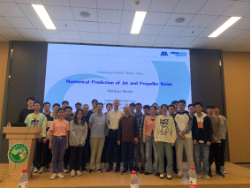 10月10日的讲座中,Matthias Meinke博士向参会师生介绍了亚琛工业大学和该校空气动力研究所的地理位置以及发展历史,并介绍该团队科研项目的经费来源、百亿亿级别的计算硬件以及计算流体力学求解器的开发情况。随后Meinke博士分析了噪声对人类健康的危害,以及欧洲对环境和产品噪声的限制政策,并由此引出对喷气机及螺旋桨噪声控制技术的讨论。Meinke博士结合其团队参与的两个欧洲科研项目,具体介绍了气动噪声数值仿真流程及先进技术方法:重点突出介绍了在航空发动机喷嘴尾缘的锯齿形设计及优化与螺旋桨噪声的精细化流场和声场的仿真分析成果贡献。整个讲座过程中Meinke博士不时与参会师生进行互动,现场气氛轻松活跃。亚琛工业大学空气动力学研究所悠久的历史,云集的流体专业领域的世界著名科学家的贡献以及当前所达到的技术水平也给在场师生留下了深刻的印象。