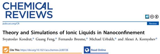 5月10日,波兰科学院Svyatoslav Kondrat副教授、华中科技大学冯光教授、伦敦帝国理工Fernando Bresme教授、以色列特拉维夫大学Michael Urbakh教授和伦敦帝国理工Alexei A. Kornyshev教授以共同通讯形式,在国际顶尖综述期刊Chemical Reviews(影响因子72.087)发表了题为“Theory and Simulations of Ionic Liquids in Nanoconfinement”的综述文章。主要综述了有关纳米限域下离子液体电解质的理论与模拟工作:从基于统计力学的理论分析模型到经典密度泛函理论,从蒙特卡洛模拟到分子动力学仿真,从研究界面平衡态结构与性质到探索非平衡态动态过程,为离子液体在实际应用中的性能优化和新领域的应用拓展提供了深入见解。