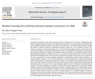 (通讯员 李牧川)2021年9月,能源和材料领域顶级期刊Materials Science and Engineering R (影响因子IF=36.214)刊发题为“Machine Learning for Predicting Thermal Transport Properties of Solids”的综述文章,第一作者和通讯作者分别为yl23411永利集团钱鑫教授和杨荣贵教授。