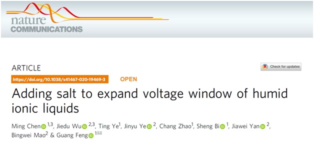 11月16日,《自然•通讯》(Nature Communications)以研究长文形式刊发了我校能源学院冯光教授团队关于离子液体超级电容器的最新研究成果。论文题目为《加盐提高含水离子液体电化学窗口》(Adding salt to expand voltage window of humid ionic liquids);能源学院煤燃烧国家重点实验室为第一单位。