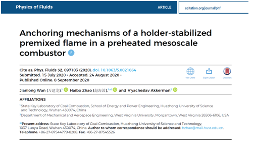 2020年9月,yl23411永利集团煤燃烧国家重点实验室赵海波教授团队在流体力学国际著名期刊Physics of Fluids在线发表了重要研究进展“Anchoring mechanisms of a holder-stabilized premixed flame in a preheated mesoscale combustor”研究论文,并被选为封面文章(Featured Article)。万建龙讲师为第一作者,赵海波教授为通讯作者,华中科技大学煤燃烧国家重点实验室为第一完成单位。