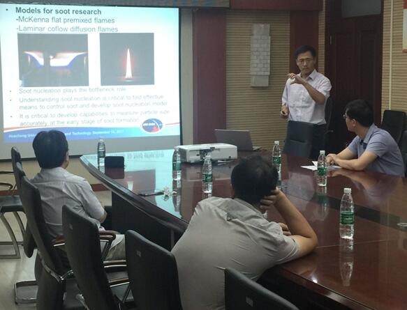本站讯(通讯员程强)2017年9月18日,应煤燃烧国家重点实验室程强老师邀请,来自加拿大国家研究院(National Research Council Canada)测量科学和标准研究所(the Measurement Science and Standards portfolio)高级研究员Dr. Fengshan Liu到煤燃烧实验室进行了交流访问,并做了题为“Challenges and Opportunities in Probing Nucleation Soot in Premixed and Diffusion Flames and Black Carbon Measurements”学术报告。