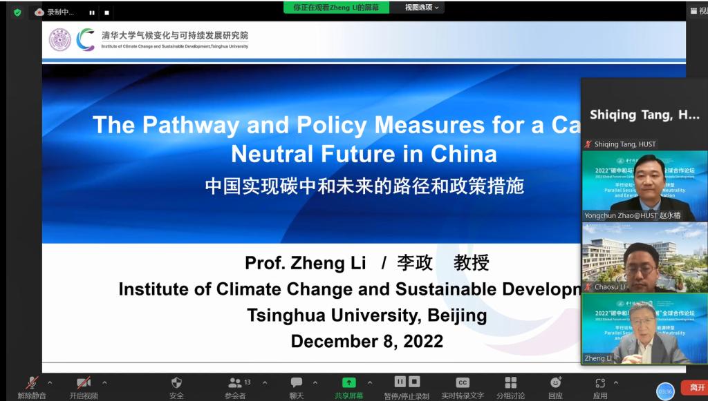 由能源学院和煤燃烧国家重点实验室承办的“平行论坛一:碳中和与能源转型”同日于线上举行。来自清华大学、美国北卡罗莱纳大学教堂山分校、香港科技大学(广州)、华中科技大学的4位专家学者围绕碳中和与能源转型作专题演讲。煤燃烧国家重点实验室副主任、能源学院教授赵永椿主持本次平行论坛。共计900余位专家学者、国内外观众通过直播平台相聚“云端”参会。